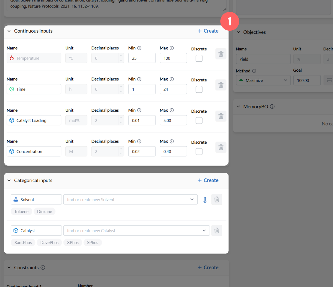 1. Define continuous & categorical parameters (temperatures, time, solvents...)