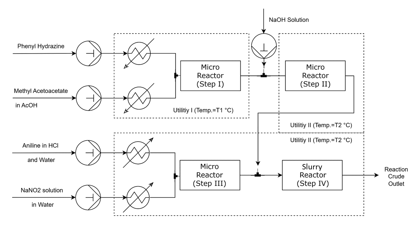 A continuous telescopic workflow was implemented using Amar-made MicroFLO™ reactors for the preparation of the coupler and diazonium salt, followed by the azo coupling step in a SlurryFLO™ reactor. This setup allowed hazardous and highly exothermic reactions to be handled in a safer, continuous manner while maintaining precise control over reaction parameters. The process was further optimized through the ReactWise software platform, which employed machine learning to identify optimal conditions, reduce experimental workload, and generate advanced process analytics.